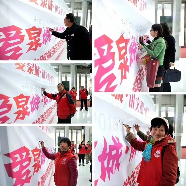 活動開始后,志愿者們拉開橫幅,開展了“愛泉城 講文明 樹新風”萬人簽名活動的第九站,現場的志愿者、中心工作人員、候車游客和市民朋友都在條幅上簽下自己的名字,助力文明旅游傳播。與此同時,志愿者們積極向候車游客發放文明旅游宣傳材料和旅游雜志,宣傳文明旅游理念,講解濟南的旅游資源和線路,鼓勵大家來到條幅前簽下自己的名字。