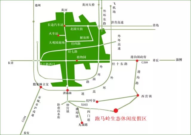 由濟(jì)南繞城高速濟(jì)南南出口下,沿103省道南行至柳埠大橋,沿左側(cè)道路行駛到達(dá)李家塘,左轉(zhuǎn)前行到達(dá)跑馬嶺生態(tài)休閑度假區(qū)。