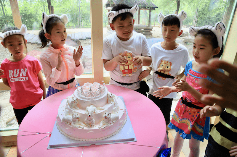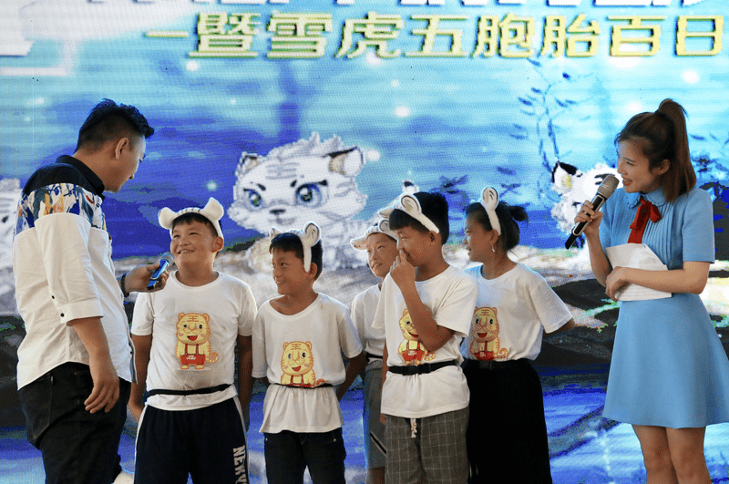 今天雪虎五胞胎出生的第100天,濟南野生動物世界在景區內金虎餐廳為五只虎崽舉辦百日派對,現場熱鬧非凡,不僅有百名游客共同慶祝,還特別邀請山東“奧運福娃”五胞胎一同見證五只小虎的成長。雪虎保育員為五虎崽制作“肉餡蛋糕”,景區也在活動場外準備了生日蛋糕與游客共同分享百日喜悅。活動期間濟南野生動物世界作為愛心資助企業,為“奧運福娃”五胞胎贈送助學基金,助資貧困家庭青少年完成學業。