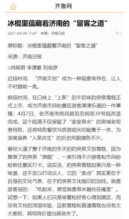 眼下,濟南正在營造世界知名的泉水文化會客廳,無論一支冰棍,還是一所院子,只要有走心的文化創意,這些都可以成為城市客廳里賞心悅目的“土特產”,而如何對其充分開掘利用,這里面其實蘊藏著濟南的留客之道。