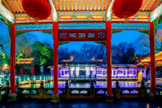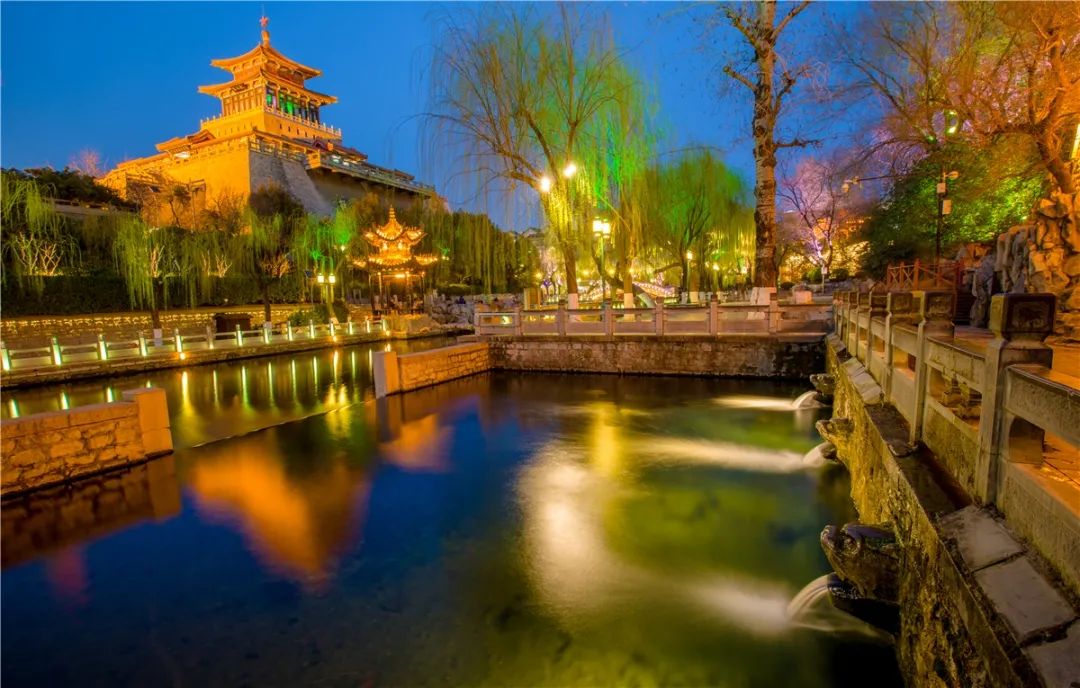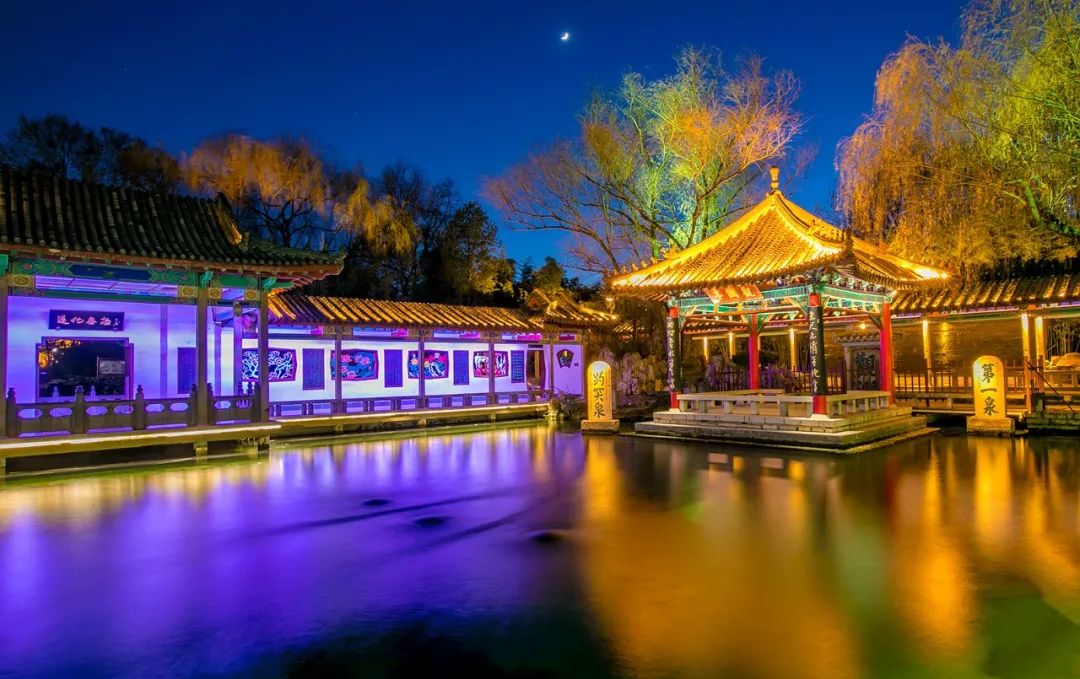夜幕之下,趵突泉內建筑古色古香,亭臺樓閣眾多,在五顏六色的燈光襯托下,景色如夢如幻。