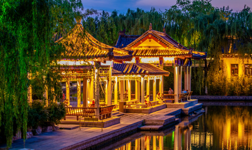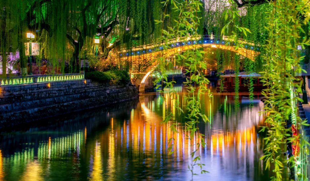 霓虹閃爍的夜景,為護城河披上了一層夢幻的面紗,展現出閃爍縹緲的獨特魅力。