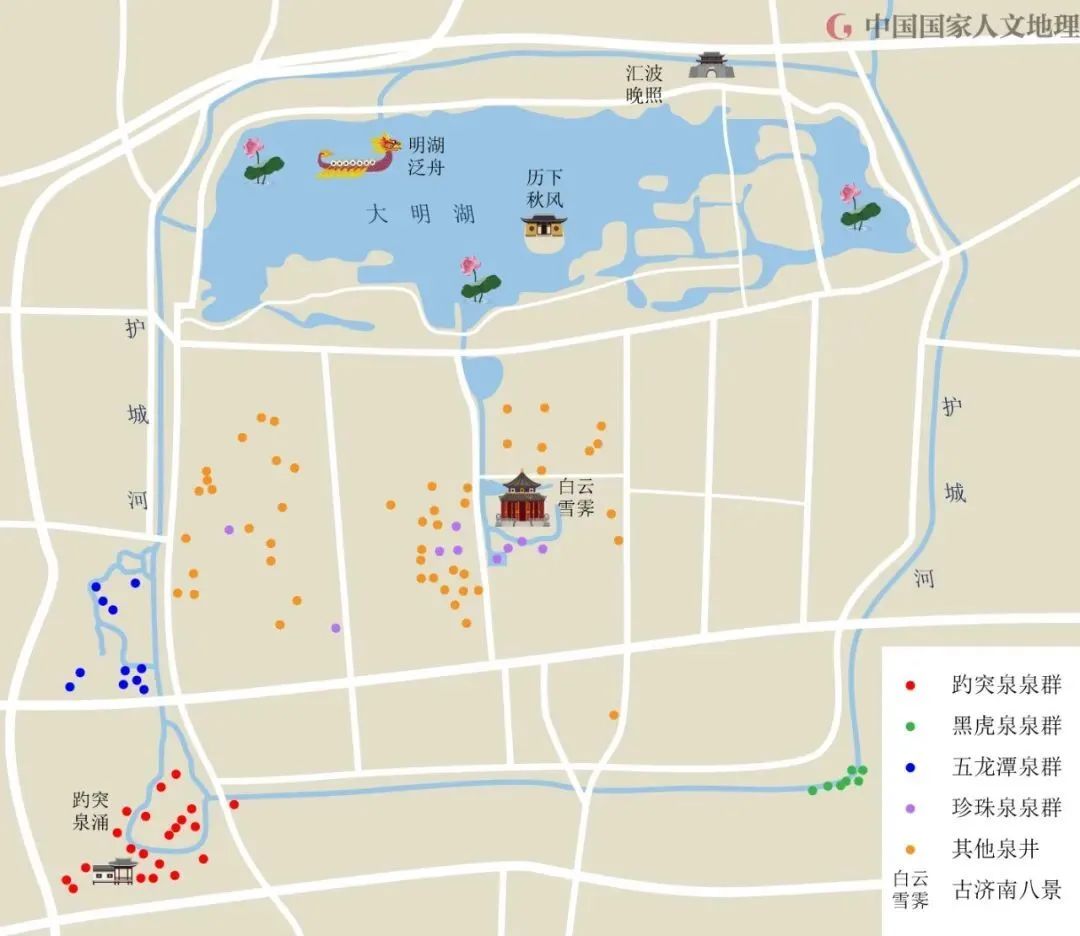 在濟南老城區僅2.6km²的范圍內,就有趵突泉、黑虎泉、五龍潭、珍珠泉四大泉群,分布有大大小小一百余處名泉。