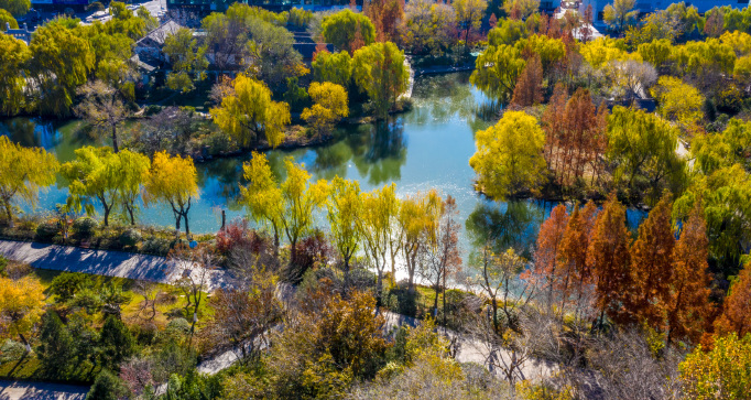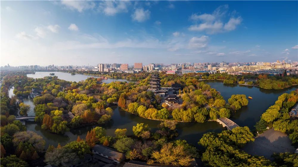 一起去打卡大明湖,登高望遠,感受濟南冬日里的爛漫與情懷。此時,大明湖景區內還是秋色濃郁,秋葉絢爛、秋果累累,偶有秋花點綴,為游客奉上藍天彩葉凈水的美麗景色。