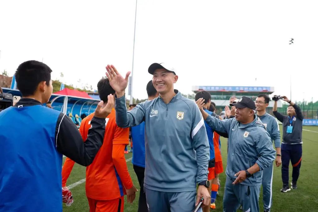 ↑山東泰山U15隊主教練周海濱賽后與隊員慶祝勝利