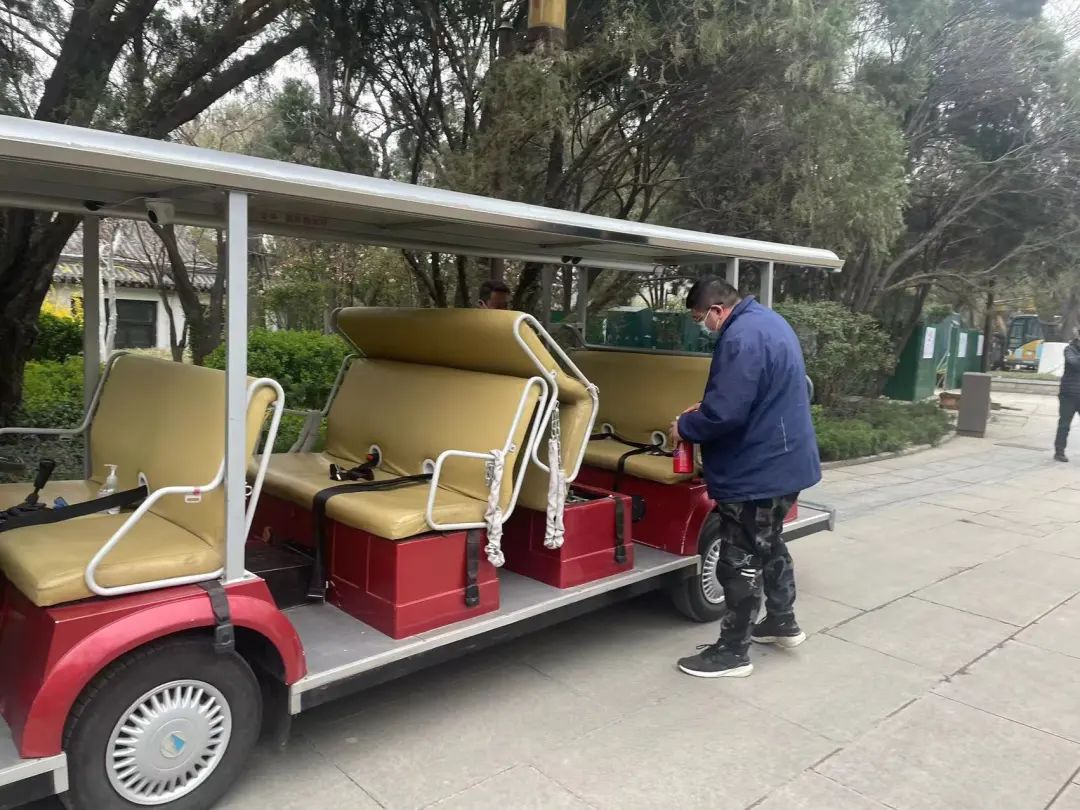 觀光車司機(jī)第一時間將車靠邊安全停放,安撫游客情緒的同時立即下車疏散游客,并觀察情況,取下隨車滅火器滅火,立即報告觀光車安全管理員說明情況,派出空車轉(zhuǎn)移游客。