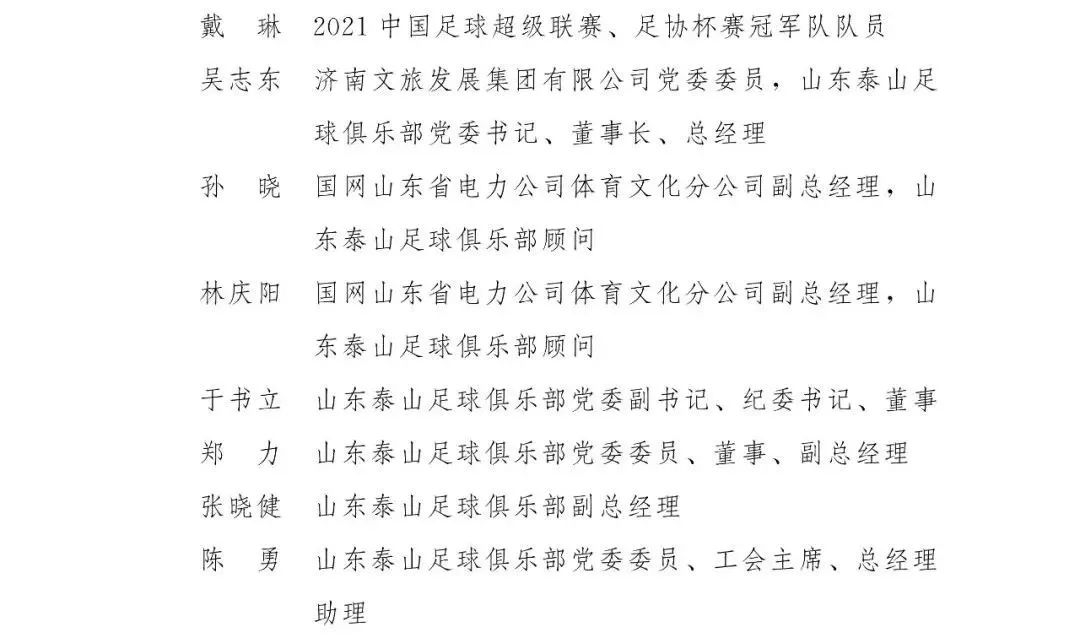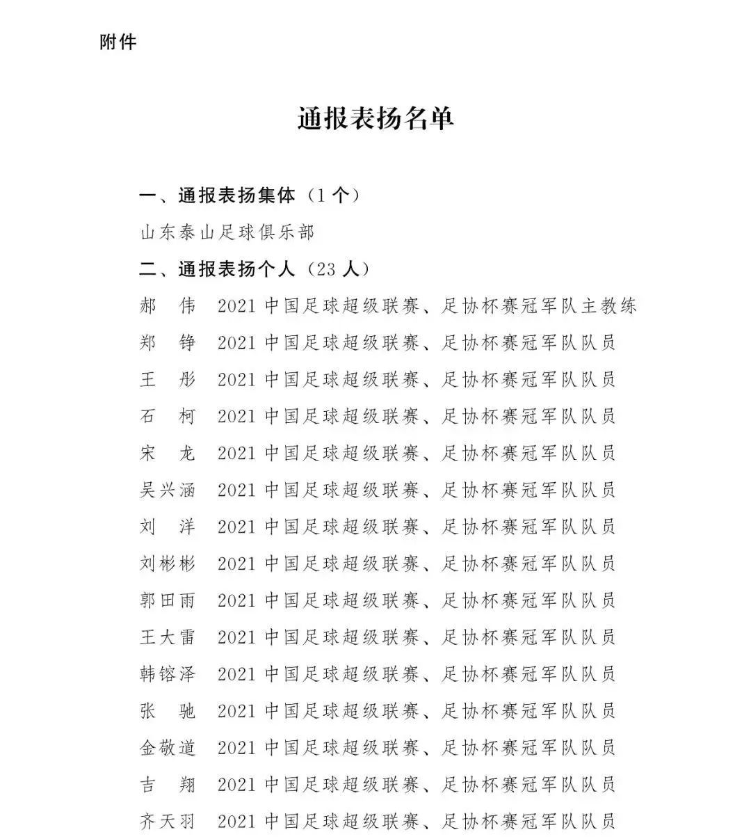 為充分發揮先進典型的示范帶動作用,大力弘揚干事創業、爭先創優精神,省政府決定,對奪得2021賽季中超聯賽、足協杯賽“雙冠王”作出突出貢獻的山東泰山足球俱樂部和郝偉等23名個人給予通報表揚。