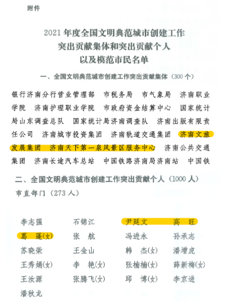 近日,中共濟南市委和濟南市人民政府下發(fā)了《關(guān)于表揚2021年度全國文明典范城市創(chuàng)建工作突出貢獻集體和突出貢獻個人以及模范市民的決定》。濟南文旅發(fā)展集團及濟南天下第一泉風(fēng)景區(qū)服務(wù)中心獲濟南市2021年度全國文明典范城市創(chuàng)建工作突出貢獻集體,尹延文(濟南天下第一泉風(fēng)景區(qū)服務(wù)中心)、高旺(濟南文旅集團旅游開發(fā)有限公司)及葛蓬(濟南奧林匹克體育中心)獲突出貢獻個人。
