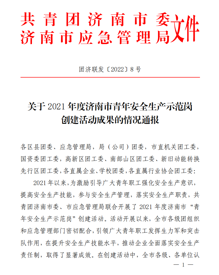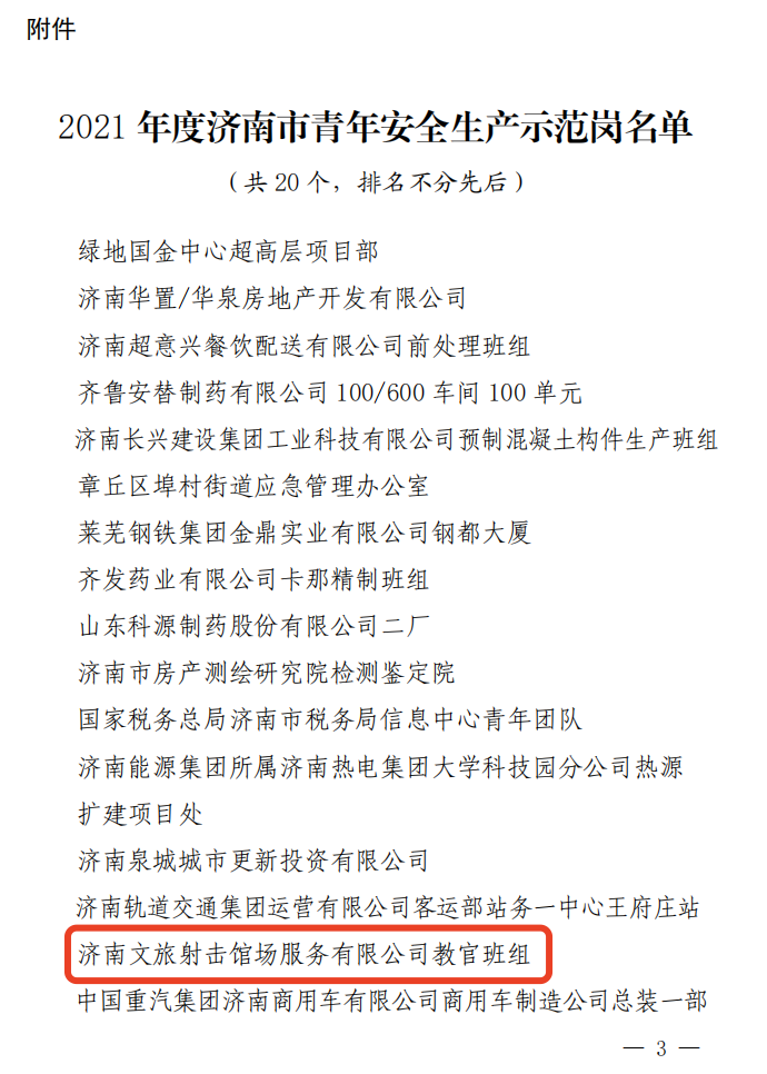 近日,共青團(tuán)濟(jì)南市委公布了《關(guān)于2021年度濟(jì)南市青年安全生產(chǎn)示范崗創(chuàng)建活動(dòng)成果的情況通報(bào)》,濟(jì)南文旅射擊館場服務(wù)有限公司教官班組榮獲“濟(jì)南市青年安全生產(chǎn)示范崗”榮譽(yù)。