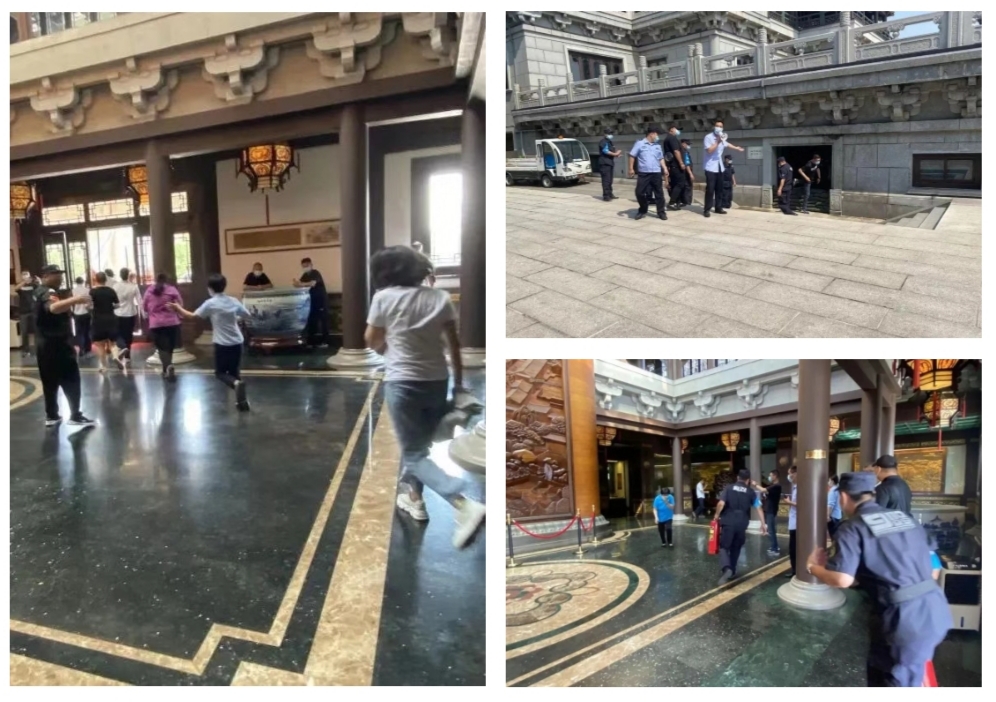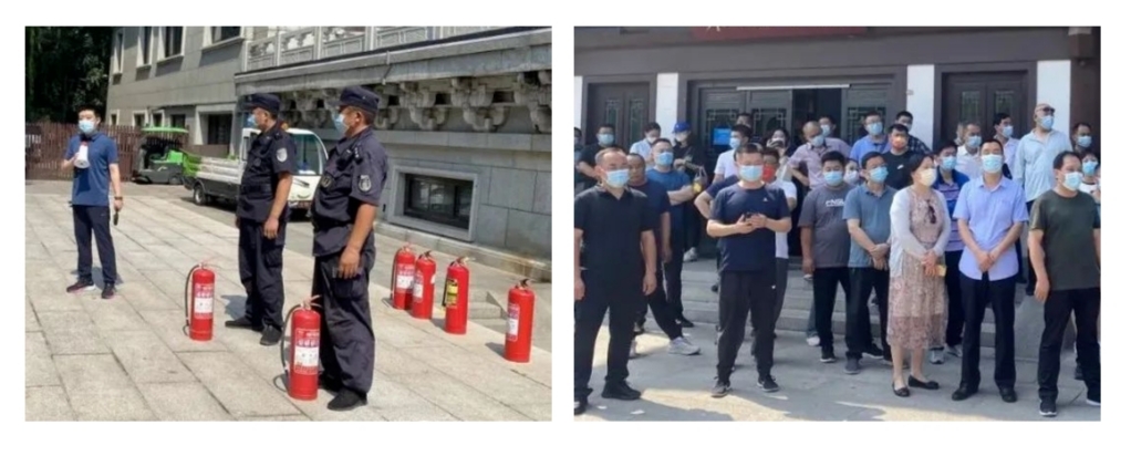 超然樓消防應急疏散演練從實戰出發,由超然樓班組長邢娟按照應急預案組織班組人員(物業人員)處置控制火情、疏散游客,安保科聽令而動、火速增援,撲滅火情、警戒現場。整個演練過程清晰順暢、措施完善、處置得當。