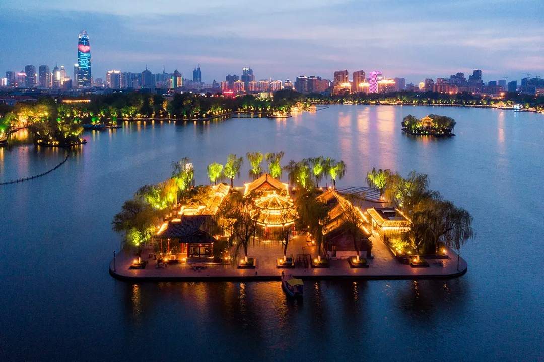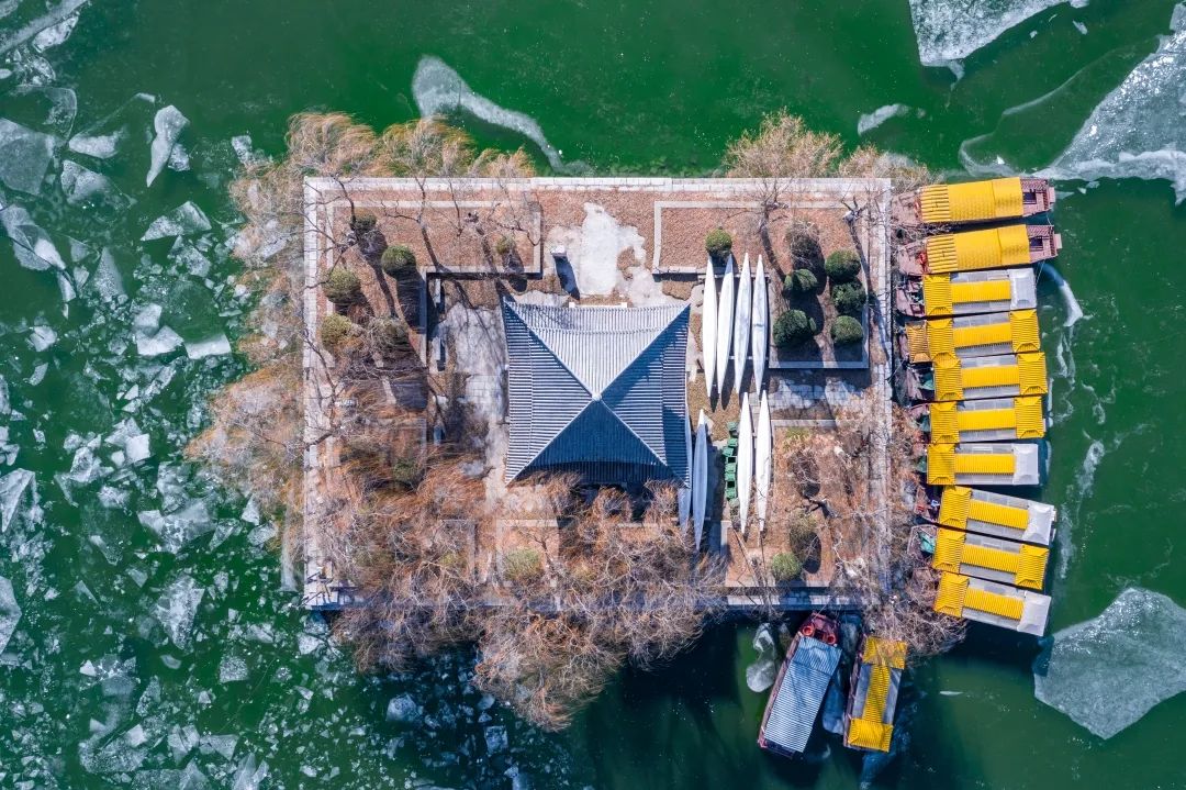 泛舟于一碧如鏡的大明湖上,可見一方形小島兀立湖中,因之名湖心島。