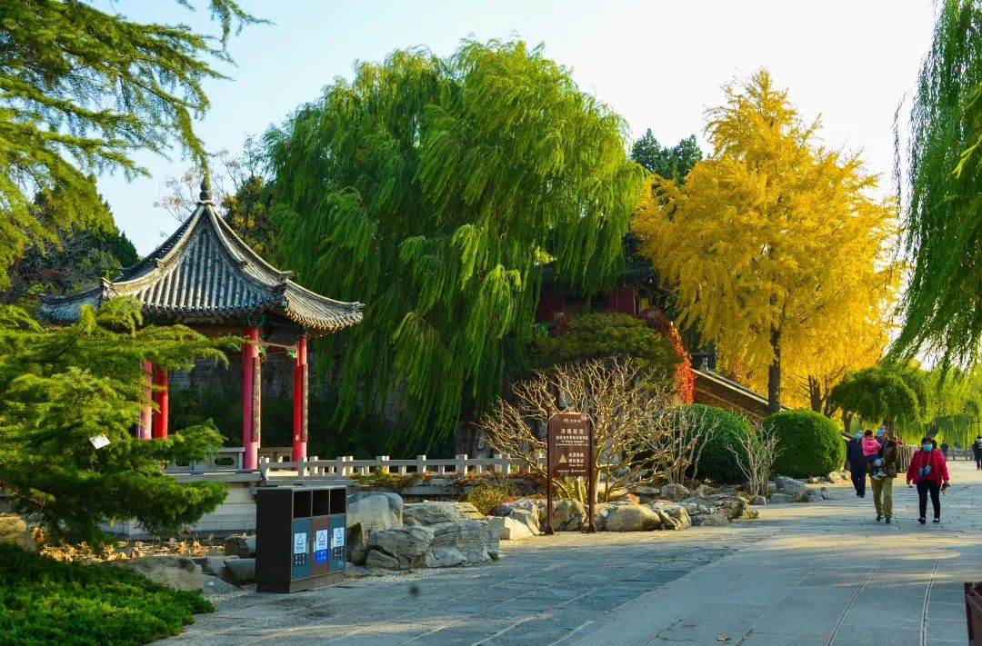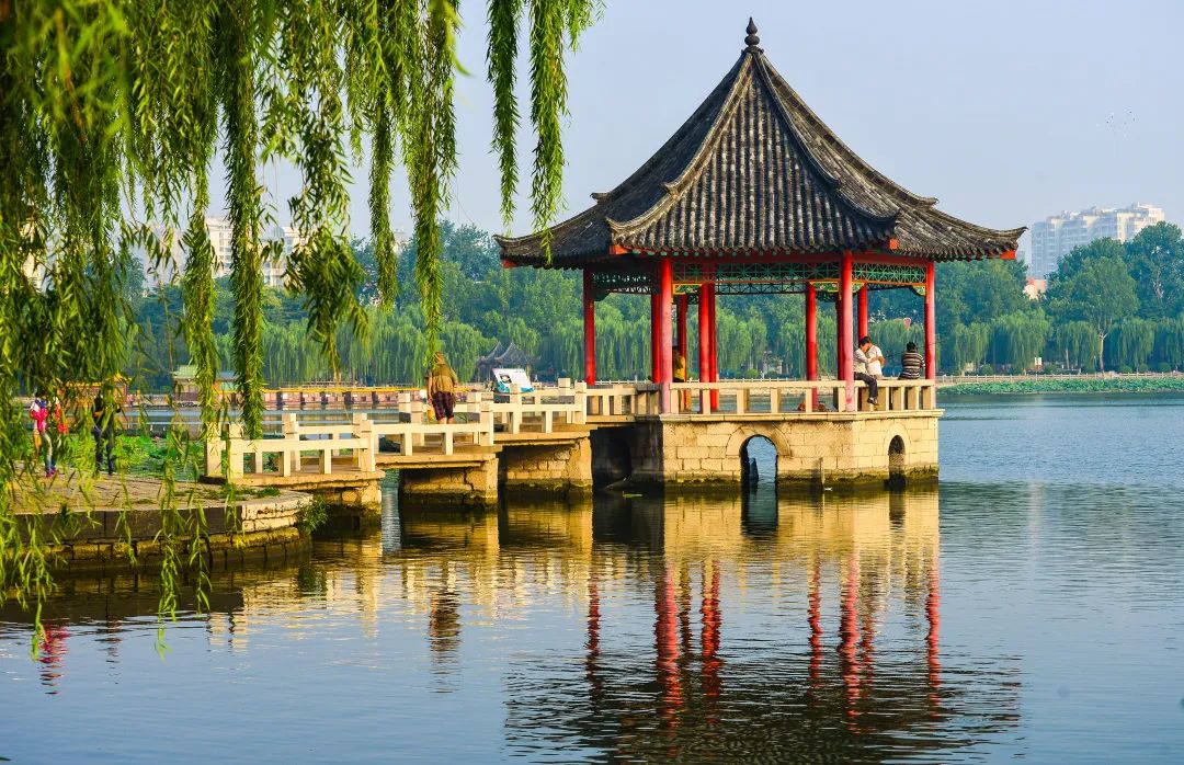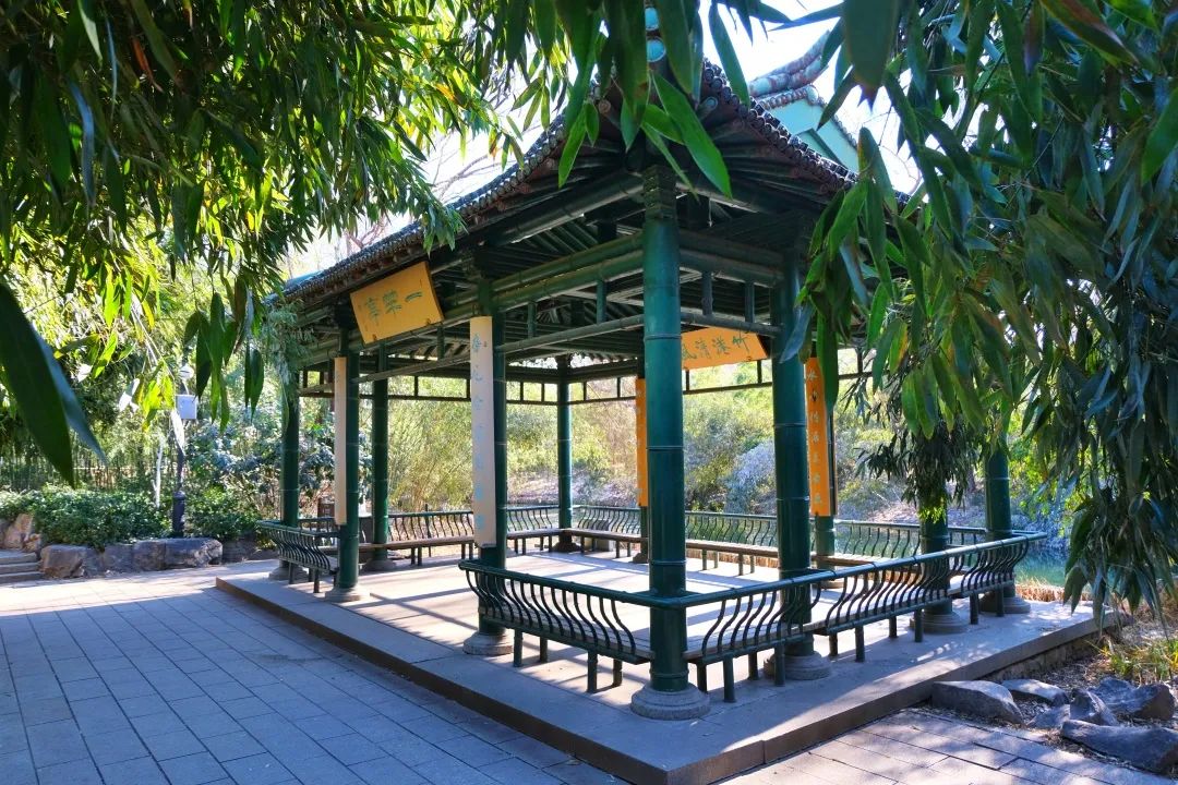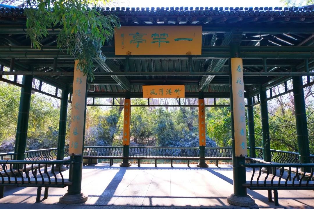 沿鵲華路南行過北渚橋十幾米,西側有一片竹林,名為“竹港清風”。竹林南端水邊建一亭,取名“一竿亭”。