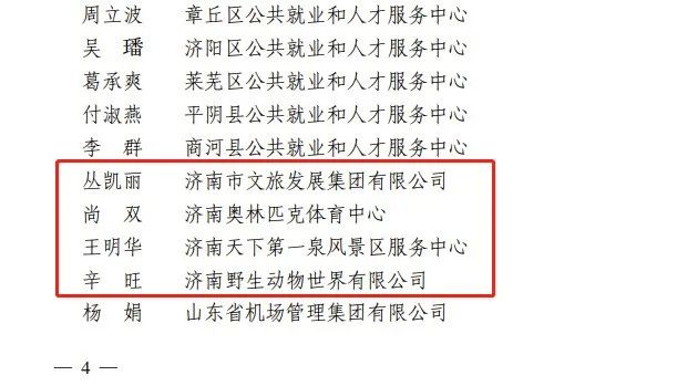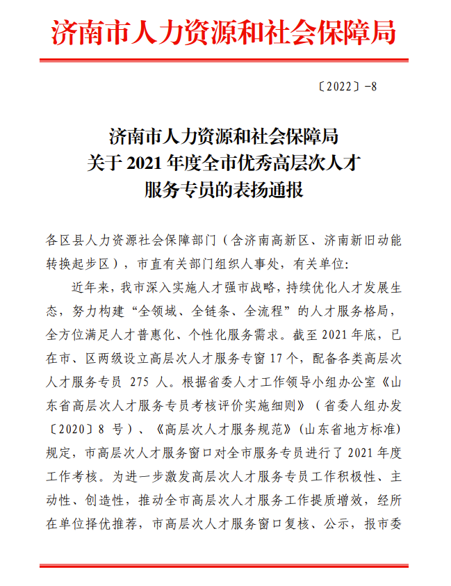 近日,濟南市人力資源和社會保障局發布了《關于2021年度全市優秀高層次人才服務專員的表揚通報》,集團人力資源部叢凱麗、濟南奧林匹克體育中心尚雙、濟南天下第一泉風景區服務中心王明華、濟南野生動物世界有限公司辛旺等4名同志獲評2021年度全市優秀高層次人才服務工作表現突出個人。