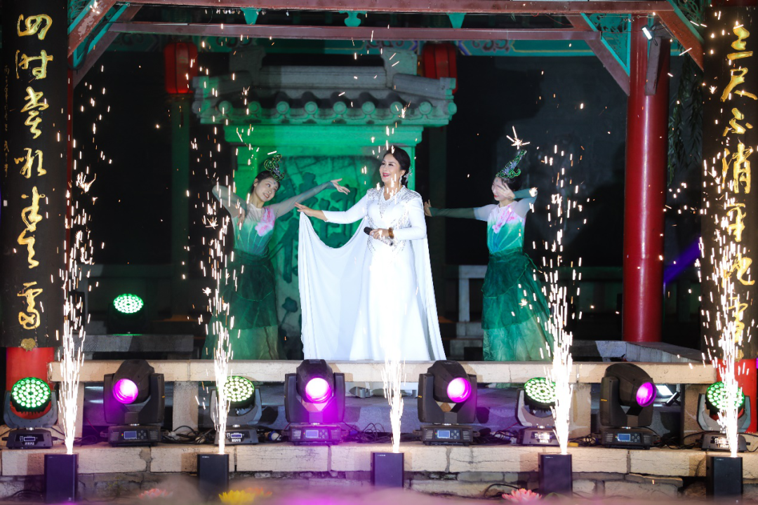 敬泉盛典現(xiàn)場(chǎng)布置圍繞趵突泉泉池進(jìn)行搭建,在原有景觀的基礎(chǔ)上增加表演區(qū)域,打造沉浸式體驗(yàn)舞臺(tái)。觀瀾亭兩側(cè)設(shè)置大型立體荷花、荷葉造型,夜幕中的趵突泉燈光璀璨,流光溢彩。