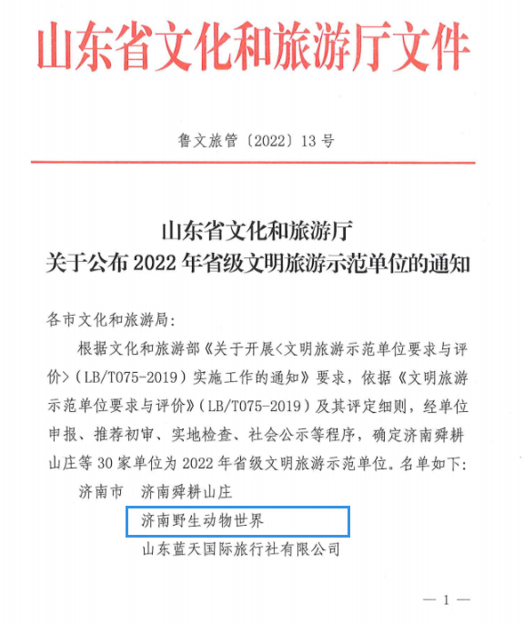 9月9日,山東省文化和旅游廳下發《關于公布2022年省級文明旅游示范單位的通知》,根據文化和旅游部《關于開展<文明旅游示范單位要求與評價>(LB/T075-2019)實施工作的通知》要求,依據《文明旅游示范單位要求與評價》(LB/T075-2019)及其評定細則,經單位申報、推薦初審、實地檢查、社會公示等程序,確定了30家單位為2022年省級文明旅游示范單位,濟南野生動物世界榜上有名。