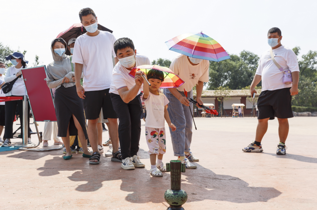 活動期間,凡是入園的游客均可參與“思念背景墻”前舉辦漢代投壺游戲。參與活動就有機會拿親子樂園通票、投喂券、紀念禮品。