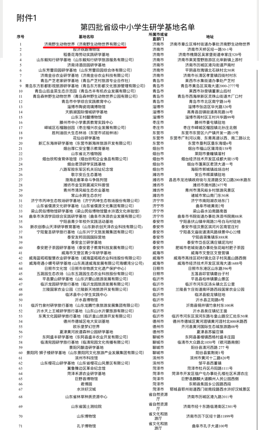 近日,山東省教育廳聯合省發改委、省文化和旅游廳對申報的第四批省級基地和課程進行了評審和公示。根據通知,山東省教育廳、省發改委、省文化和旅游廳對各申報單位的有關材料認真審查,遴選考核,對部分基地還進行實地考察,最終確定了74家申報單位為第四批省級中小學生研學基地,以科普與觀光并重的濟南野生動物世界成功入選,名列榜首!