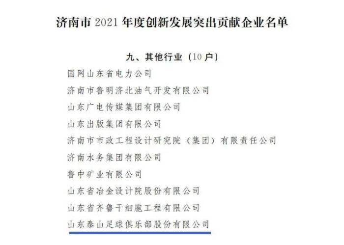 日前,《濟(jì)南市人民政府關(guān)于表揚(yáng)2021年度創(chuàng)新發(fā)展突出貢獻(xiàn)企業(yè)的通報(bào)》發(fā)布,山東泰山足球俱樂部股份有限公司榜上有名。
