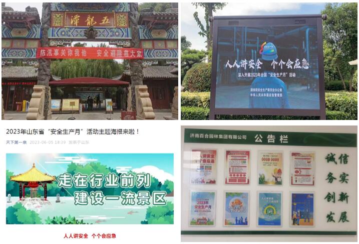 3. 開展廣泛宣傳。各單位結合實際,多形式、多角度進行宣傳。第一泉景區(qū)利用微信公眾號轉(zhuǎn)發(fā)山東省“安全生產(chǎn)月”宣傳海報,在趵突泉、五龍?zhí)?、大明湖等人流密集區(qū)域懸掛宣傳橫幅22條。旅開公司、濟南野生動物世界、產(chǎn)業(yè)運營公司等利用大屏幕持續(xù)滾動播放安全知識和宣傳標語,通過懸掛條幅、制作宣傳海報等方式對安全生產(chǎn)月活動進行大力宣傳。同時,百合園林、萊蕪城投在辦公區(qū)域宣傳欄、樓道等醒目位置張貼“安全生產(chǎn)月”活動主題標語或宣傳畫,營造全員關心安全生產(chǎn)、參與安全發(fā)展的濃厚輿論氛圍。