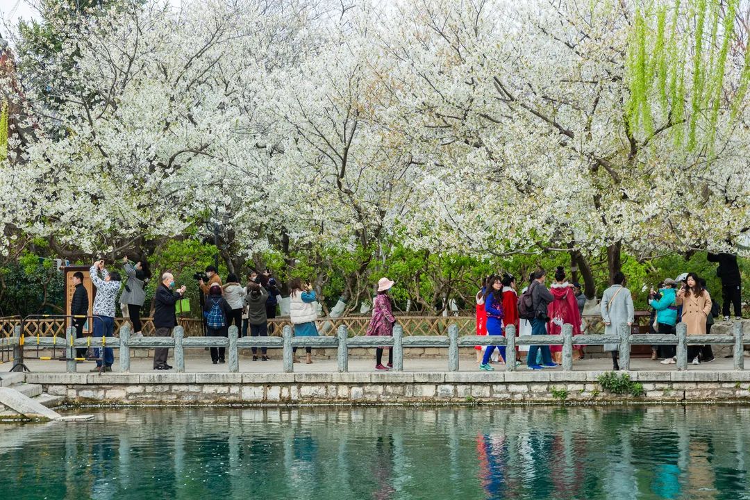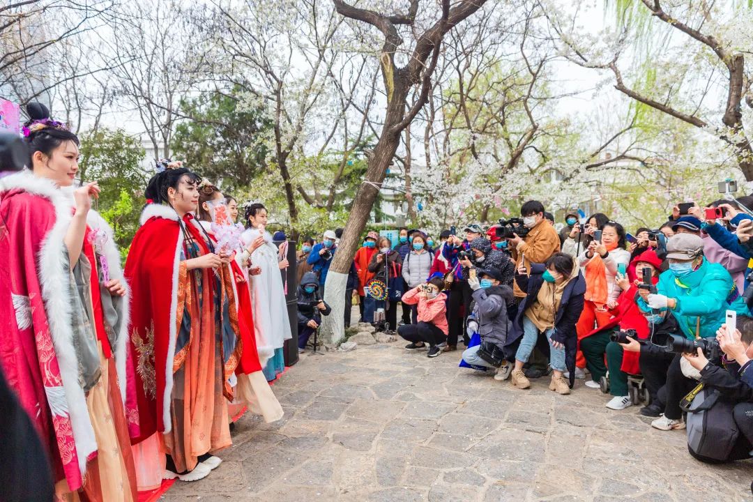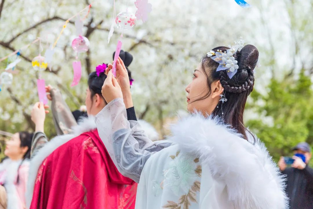 櫻花節(jié)期間將推出櫻花文化風(fēng)情展和特色演藝互動(dòng)活動(dòng),每周六周日組織漢服巡游。微風(fēng)拂過,泉水映襯,五龍?zhí)豆珗@櫻花林內(nèi)的清香沁入心脾,透過陽光,有花瓣飄落,身著華服的小姐姐們?cè)跇湎陆?jīng)過,仿佛穿越千年,又似人間仙境。同時(shí),五龍?zhí)豆珗@東門小廣場(chǎng)特設(shè)了“櫻雨心愿”活動(dòng)區(qū)。市民游客可將心愿寫在愿望卡上,懸掛于櫻花樹下。