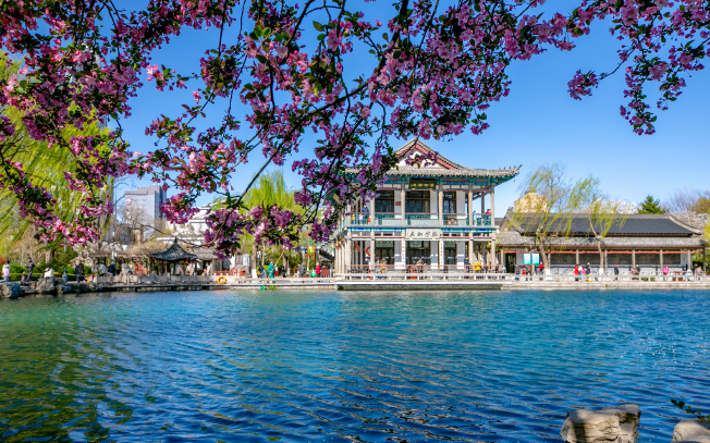 春天的五龍潭美不勝收,梅花、玉蘭、海棠、櫻花等次第開放,吸引眾多市民和游客來此感受泉城春天之美。