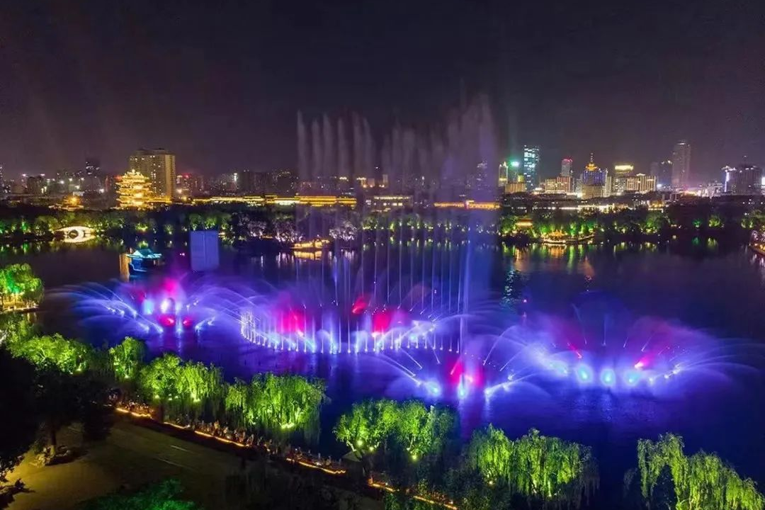 若是趕巧,還能在大明湖北岸觀一場“明湖秀”,湖水以四散的態勢向空中奔涌,配合著多彩的光譜,組成一幕幕水屏在夜色中綻放,驚艷了整個泉城的夜晚。