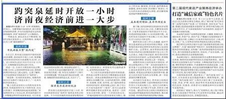 2023年6月5日,《濟南日報》刊發題為《趵突泉延時開放一小時 濟南夜經濟前進一大步》的文章,采寫記者為劉燁。文章寫到,調整趵突泉公園的夜間開放時間,濟南文旅集團和天下第一泉風景區服務中心更多基于公益角度出發,希望發揮城市核心景區的表率帶頭作用,為城市夜經濟增加載體,營造高品質夜間文旅消費環境,滿足人民對美好生活的文化需要,進一步促進夜經濟繁榮發展。如下為稿件詳情——