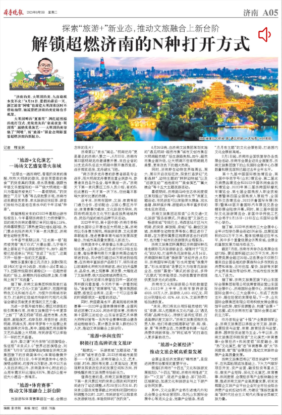 2023年9月5日,《齊魯晚報》刊文《探索“旅游+”新業態,推動文旅融合上新臺階 解鎖超燃濟南的N種打開方式》。對濟南文旅集團做實產業矩陣,深化文化演藝、體育賽事、休閑度假、會展經濟等產業板塊融合發展,推進濟南文旅產業高質量發展進行了詳細報道。如下為稿件詳情——