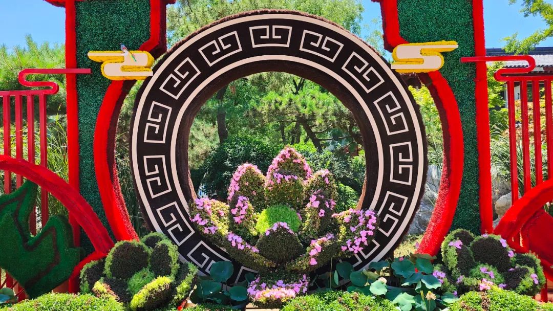 東門外廣場大型造型命名為“荷諧玫好”,由荷花、玫瑰兩種市花及扇面組成。扇面中的曲線代表著山水如畫,與蝴蝶、云彩、燈籠等吉祥要素共同組成了一幅和諧美好的畫面。鋼琴廣場品種荷花造型名為“魚躍龍門”,由中國古代神話故事激發靈感創作,表達了奮發向上、夢想成真、金榜題名之意。
