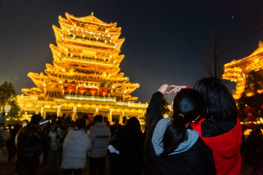 2023年春節假期以來(1月21日-2月8日),超然樓已接待入樓游客近3萬人次,是去年同期客流量的4倍,售票收入也翻了兩番。晚間亮燈時分,超然樓廣場更是人頭攢動、摩肩接踵,瞬時最高客流量達到2000人次。
