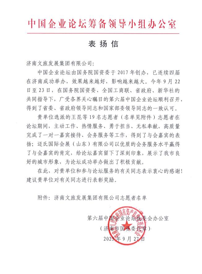 近日,第六屆中國企業(yè)論壇執(zhí)委會辦公室向濟(jì)南文旅集團(tuán)發(fā)來表揚信,信中寫到: