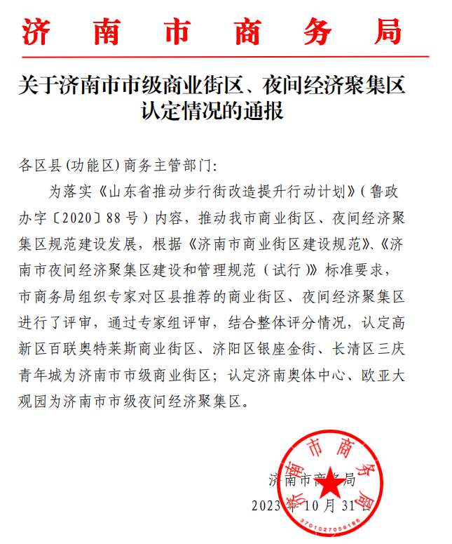 近日,濟(jì)南市商務(wù)局組織專家對(duì)區(qū)縣推薦的商業(yè)街區(qū)、夜間經(jīng)濟(jì)聚集區(qū)進(jìn)行了評(píng)審,通過(guò)專家組的評(píng)審,結(jié)合整體評(píng)分情況,濟(jì)南奧體中心被認(rèn)定為濟(jì)南市市級(jí)夜間經(jīng)濟(jì)聚集區(qū)。