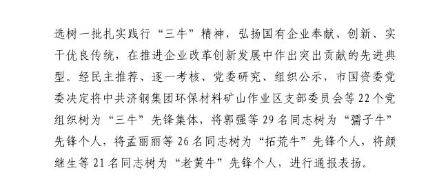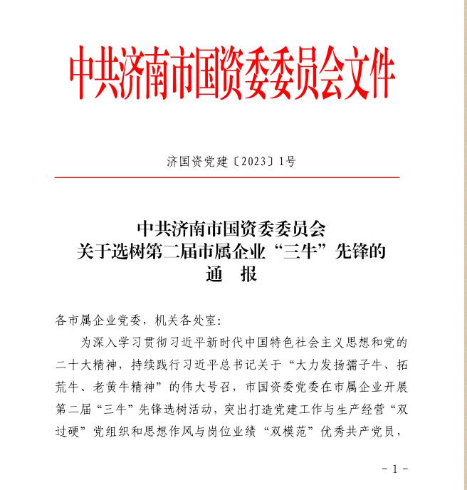 近日,市國資委發布《關于選樹第二屆市屬企業“三牛”先鋒的通報》。濟南文旅集團馬國康同志為“孺子牛”先鋒個人,楊學惠同志為“拓荒牛”先鋒個人,李迎同志為“老黃牛”先鋒個人,進行通報表揚。
