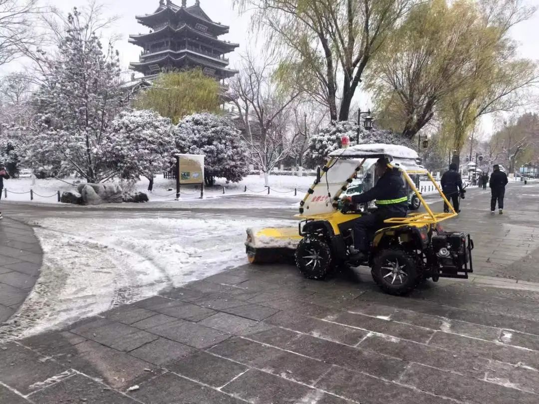 天下第一泉景區(qū)接到雪情預(yù)報(bào)后,啟動(dòng)應(yīng)急預(yù)案,夜間預(yù)留掃雪人員50余人,第一時(shí)間在園區(qū)各橋梁、出入口等處鋪設(shè)防滑材料,擺放防滑提示,設(shè)置語音提示。掃雪采取機(jī)械掃雪和人工清雪相結(jié)合,共投入人工200余人次,投放掃雪車2臺(tái)、改裝叉車1臺(tái)、灑水車1臺(tái)清理主干道積雪,人工清理廣場(chǎng)、橋頭積雪,使用竹桿等清理樹上積雪,真正做到雪停路清。