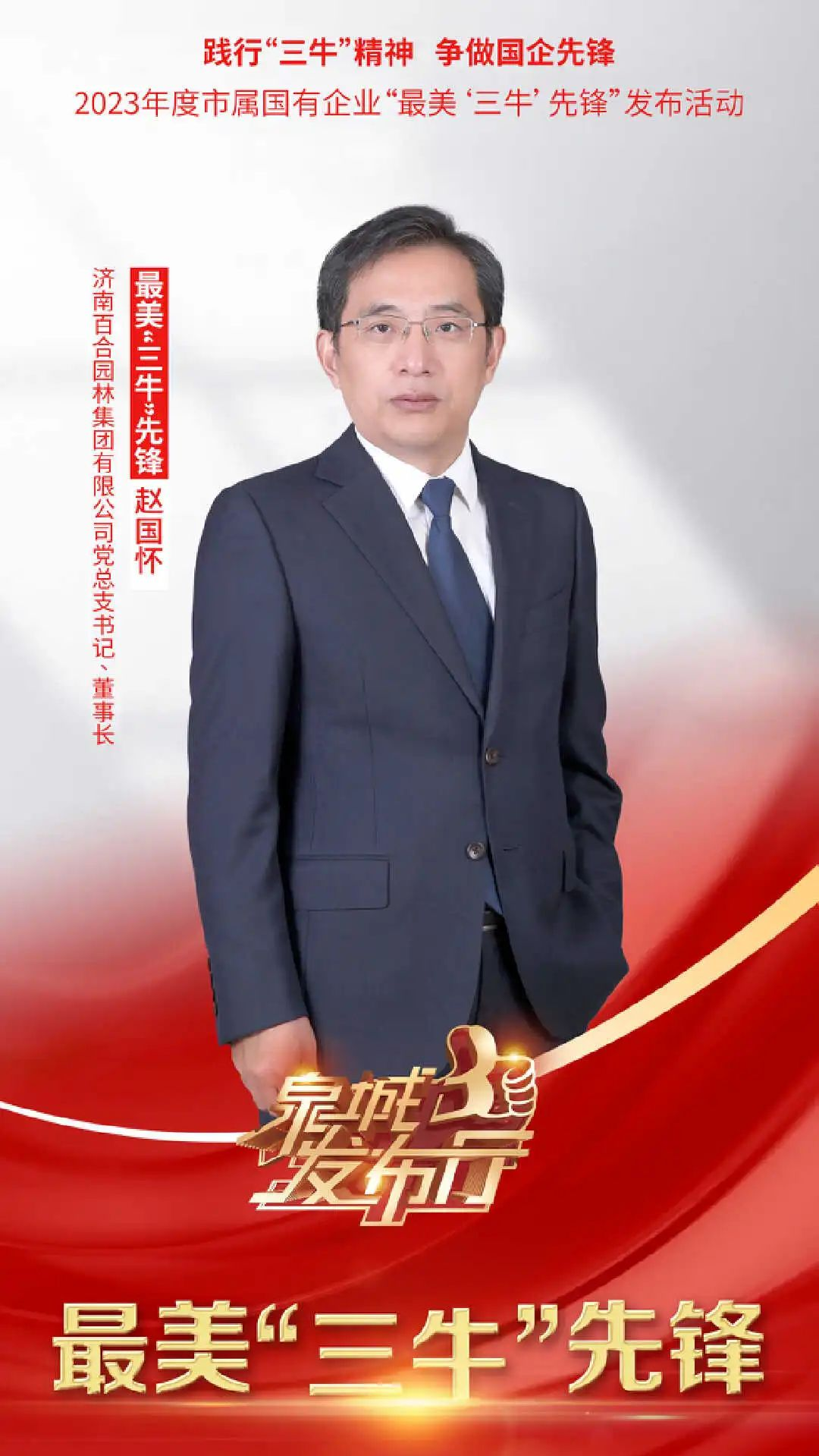 踐行“三牛”精神,爭做國企先鋒。12月14日,2023年度市屬國有企業“最美‘三牛’先鋒”發布活動在濟南廣播電視臺演播大廳舉行。活動現場,對10位“最美‘三牛’先鋒”的事跡進行了發布,并為“最美‘三牛’先鋒”頒獎。集團權屬單位濟南百合園林集團有限公司黨總支書記、董事長趙國懷獲評“最美‘三牛’先鋒”。