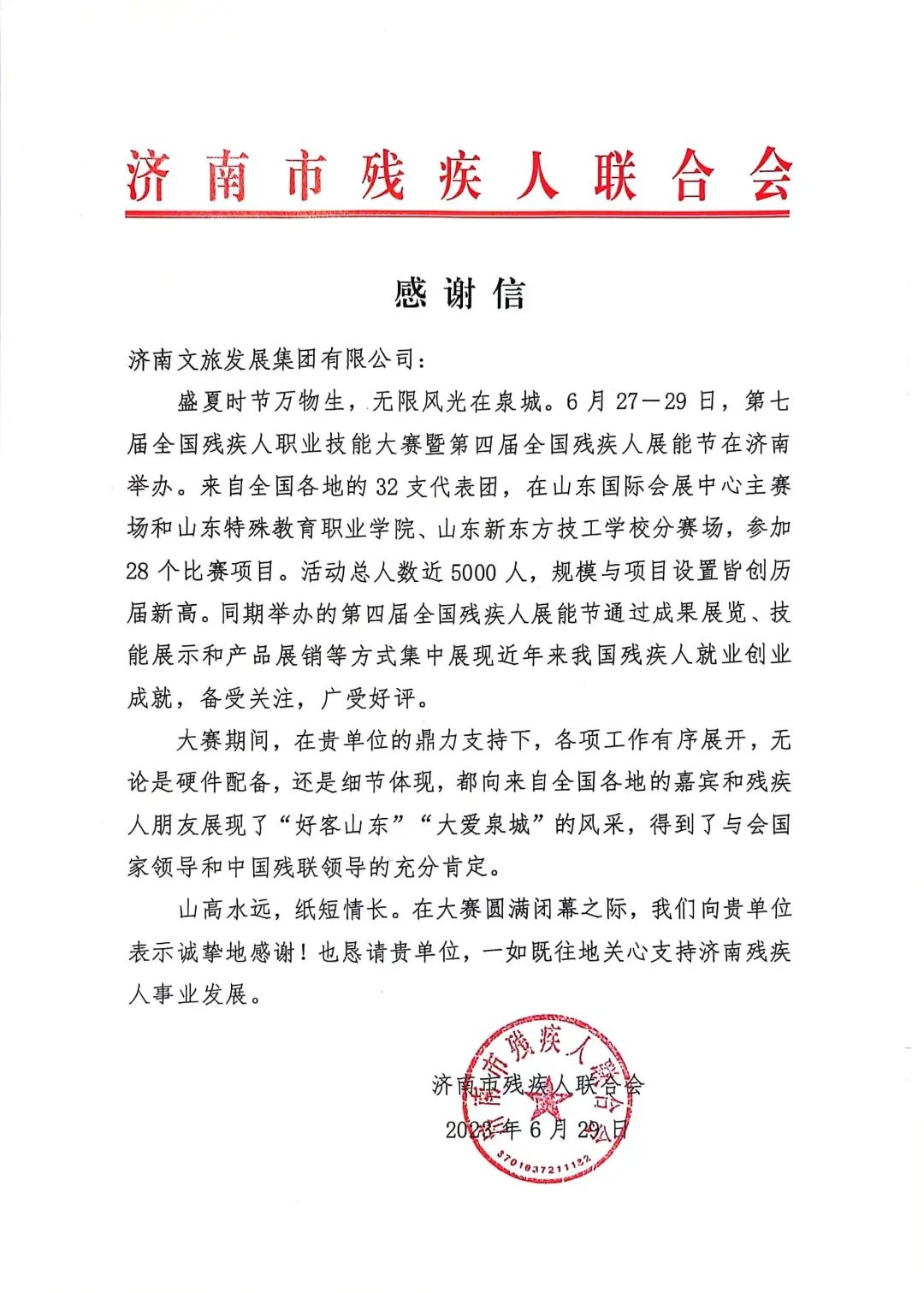 近日,濟南市殘疾人聯合會向濟南文旅集團發來感謝信,感謝信稱:6月27一29日,第七屆全國殘疾人職業技能大賽暨第四屆全國殘疾人展能節在濟南舉辦。在貴單位的鼎力支持下,各項工作有序展開,得到了與會國家領導和中國殘聯領導的充分肯定。在大賽圓滿閉幕之際,我們向貴單位表示誠摯地感謝!也懇請責單位,一如既往地關心支持濟南殘疾人事業發展。