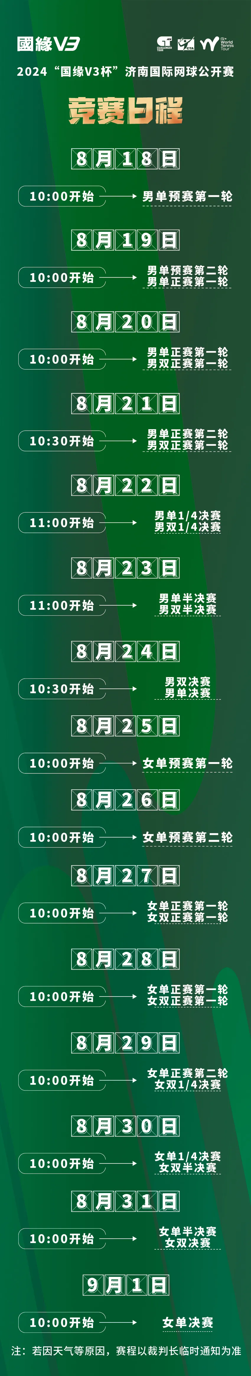 男單預(yù)賽將于8月18日至8月19日激烈展開,為正賽預(yù)熱;而男子的正賽則將于8月19日至8月24日展開激烈角逐,男雙和男單決賽定于8月24日上演。緊接著,女單選手們將在8月25日至8月26日進(jìn)行激烈的預(yù)賽角逐,為正賽的開啟預(yù)埋伏筆;女子正賽將在8月27日至9月1日精彩上演,女雙決賽定于8月31日舉行,而備受期待的女單決賽將在9月1日震撼登場。