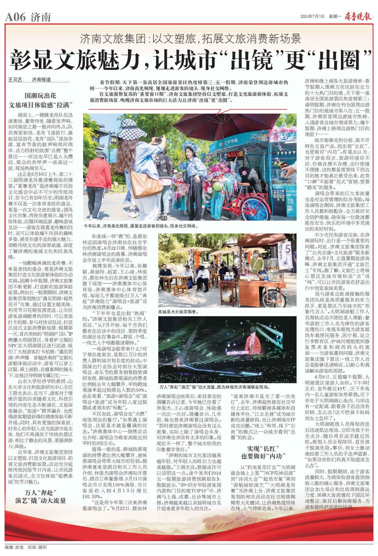 2024年7月1日,《齊魯晚報》刊發《濟南文旅集團:以文塑旅,拓展文旅消費新場景,彰顯文旅魅力,讓城市“出鏡”更“出圈”》的文章,采寫記者為王貝藝。文章寫到,在文旅強勢復蘇的“重要窗口期”,濟南文旅集團堅持以文塑旅,打造文化旅游新體驗,拓展文旅消費新場景,喚醒濟南文旅市場的巨大活力,讓濟南“出鏡”更“出圈”。如下為稿件詳情——