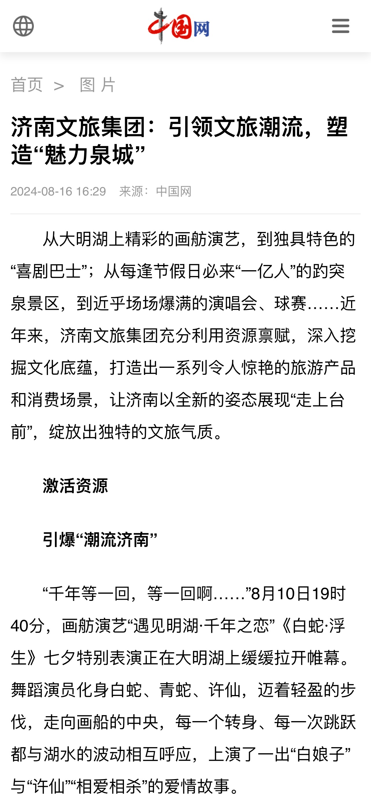 近日,《中國網》聚焦濟南文旅集團,以《濟南文旅集團:引領文旅潮流 塑造“魅力泉城”》為題,對集團挖掘文化底蘊,打造出一系列旅游產品和消費場景的經驗做法予以宣傳報道,人民日報社中國經濟周刊官網等媒體紛紛轉載。文章寫到:近年來,濟南文旅集團充分利用資源稟賦,深入挖掘文化底蘊,打造出一系列令人驚艷的旅游產品和消費場景,讓濟南以全新的姿態展現“走上臺前”,綻放出獨特的文旅氣質。如下為稿件詳情——