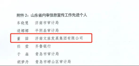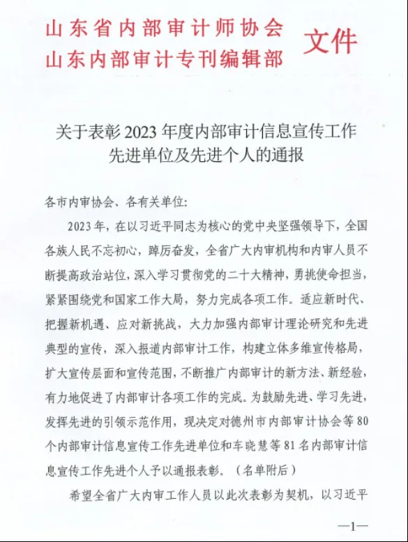 山東省內部審計師協會、山東內部審計專刊編輯部印發《關于表彰2023年度內部審計信息宣傳工作先進單位及先進個人的通報》,集團合規部(審計部)董喆同志獲評2023年度全省內審信息宣傳工作先進個人。